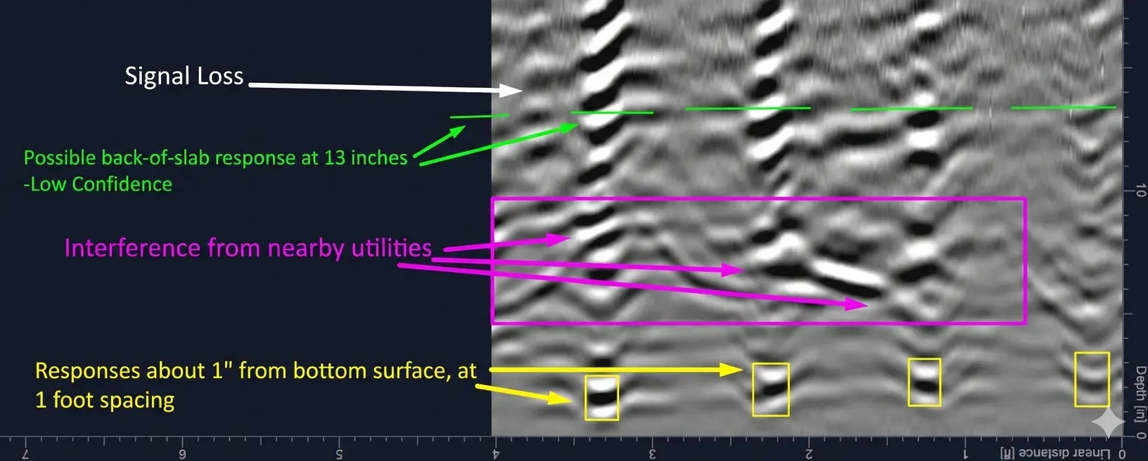 Multi-Layer Mapping: The scans identified four distinct layers of reinforcement at varying depths and spacings (ranging from 1-foot to 4-foot intervals).